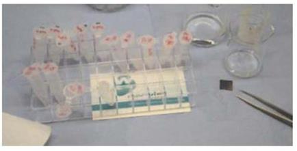 AVAC含有一种一次性试剂盒,它由大小为 120x80 mm2 的多介质基板和可拆卸的 96 孔硅胶结构组成。 滤芯的尺寸设计与医院和分析实验室中常规使用的样品处理系统兼容。 最近,又新推出一种具有 16 孔玻片格式的新测试盒。